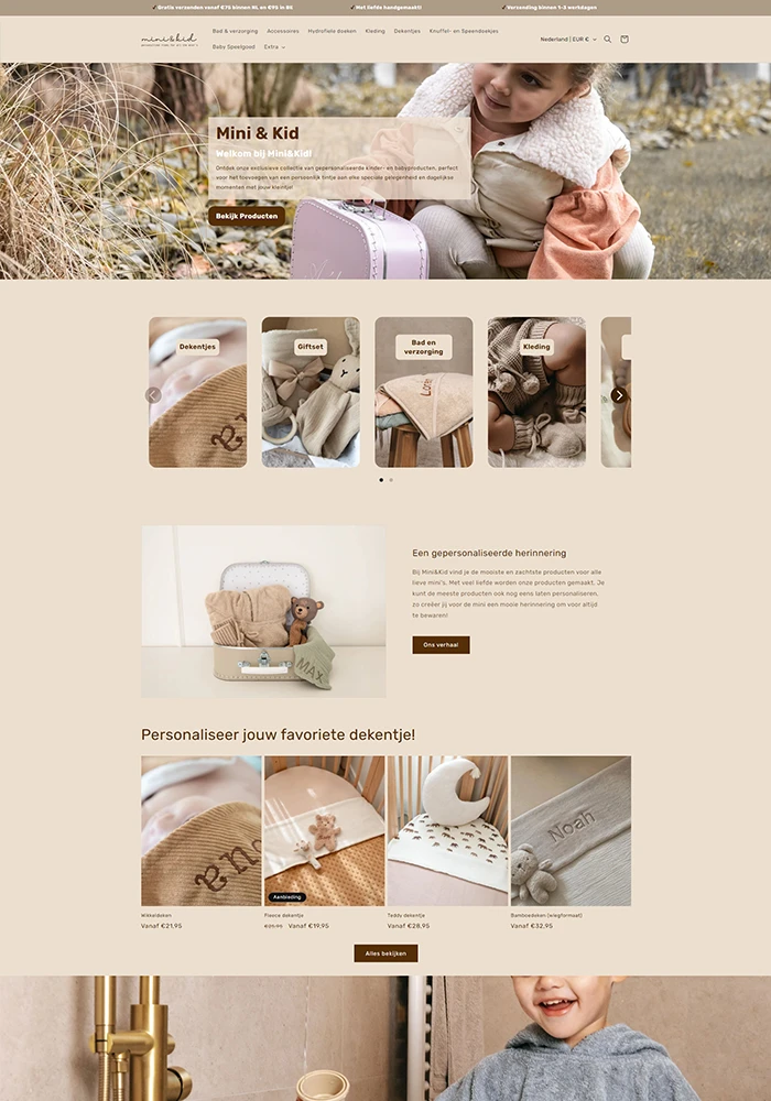 Esra en Esmee beheerden hun webshop oorspronkelijk via het systeem van Mijn Domein. Al snel liepen ze echter tegen problemen aan: de functionaliteit liet te wensen over en de uptime was onvoldoende. Na een grondige verkenning van alternatieven, kozen ze voor Shopify. Hun belangrijkste zorg betrof de mogelijkheid om producten te voorzien van personalisatie-opties — een essentieel element voor de toegevoegde waarde die Mini & Kid biedt aan haar klanten.