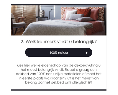 Die module kwam tot stand door op basis van de gebleken klantervaringen de materie te koppelen aan een 3 vragen-proces. De eerste vraag betreft de persoonlijke beleving van de bezoeker (zoals of die het gauw warm of juist koud heeft), de tweede of bepaalde kenmerken van belang zijn (zoals anti-allergisch of 100% natuurlijke materialen) en de derde of er voorkeur is voor een bepaalde vulling (dons, wol, tencel, etc). Binnen die 3 vragen zijn in totaal ~20 keuzemogelijkheden opgenomen in 3 opties, zónder de verplichting om die ook allemaal in te vullen. Op basis van de zo verkregen input selecteert de module bijpassende producten en krijgt de bezoeker een kant-en-klare link naar dit overzicht. Niet moeilijk doen door het mailen van een overzicht, geen onnodige gegevens vragen en geen cookies die alles vastleggen. Gewoon een URL die de wensen respecteert en die binnen enkele milliseconden klaar staat voor de bezoeker.